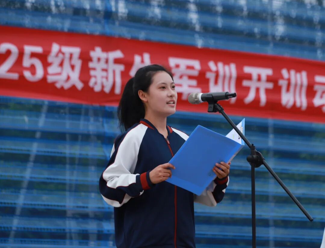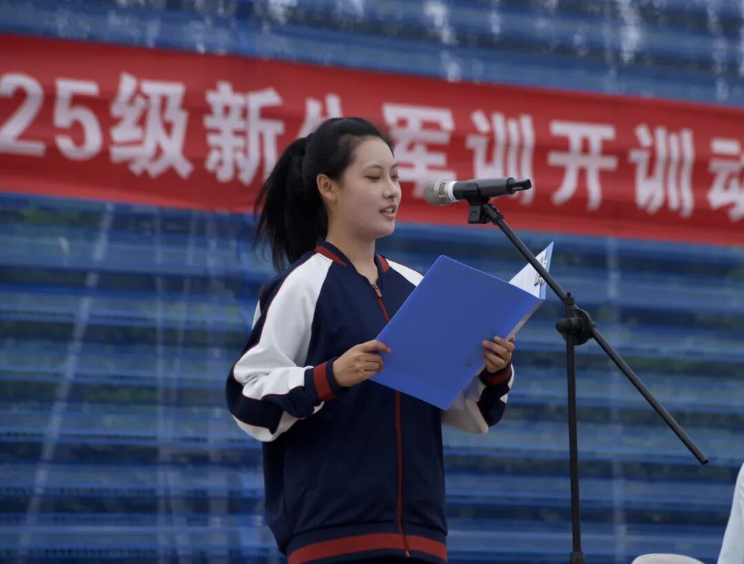 军训开训动员大会|人工智能学院王雨宁同学作为2025级新生代表登台发言诠释AI学子青春担当