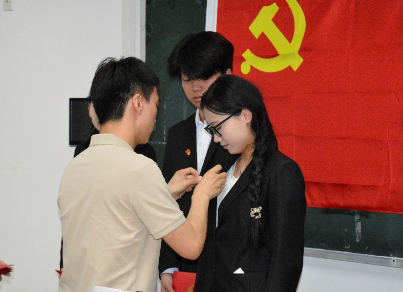 党总支副书记王鸿为他们佩戴党徽,并颁发“政治生日”贺卡