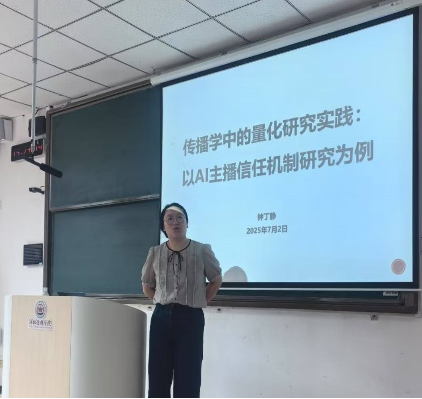 7月2日,人工智能学院举办“多传播学中的量化研究实践——以AI主播信任机制研究为例”主题讲座,本次讲座是“幸会”学术研习社第七讲。主讲人是香港大学理学硕士、中国传媒大学新闻学专业博士生钟丁静。人工智能学院全体专业教师参加讲座。